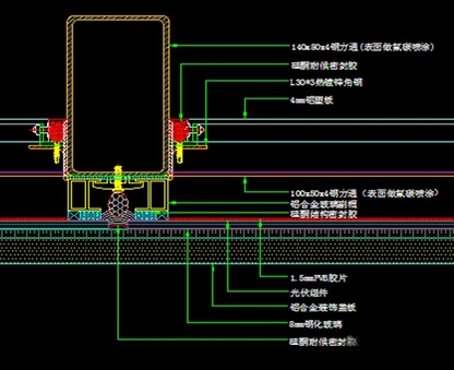 系統有十個規格的電池幕墻玻璃尺寸,有8毫米超白玻璃為基板,周邊留有打膠的空距,電池組件電性能均為:30V/230kw,由156X156多晶硅芯片組成,系統安裝結構簡圖如下。光伏系統框架是鋼結構,整個背面用高強度板遮蔽,使整體性更加好。