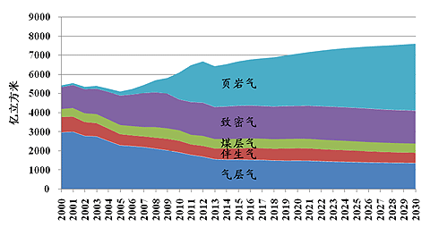 頁巖氣:近年來,由于頁巖氣勘探開發(fā)相關技術的突破,美國頁巖氣產(chǎn)量快速增長。根據(jù)美國能源信息署(EIA)的統(tǒng)計,2000-2012年,美國頁巖氣年產(chǎn)量由117.96億立方米上升至2762.95億立方米;2000-2014年,頁巖氣產(chǎn)量占天然氣總量從1.7%迅速接近40%。與此同時,常規(guī)天然氣占天然氣總產(chǎn)量的比重不斷下降,來自常規(guī)氣田的天然氣產(chǎn)量占天然氣總產(chǎn)量的比重由2000年的73.3%下降至2012年的43.1%。EIA預測美國頁巖氣產(chǎn)量見下圖。