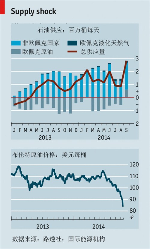 國際油價下跌的同時,全球石油日供應量卻增長了近91萬桶,OPEC國家與非OPEC國家都在增產(chǎn)。與2013年同期相比,2014年全球石油供應總增長280萬桶每日。受利比亞原油恢復生產(chǎn)和伊拉克產(chǎn)量繼續(xù)提升的推動,OPEC國家9月的原油產(chǎn)量飆升到了13個月的新高,較8月的3066萬桶每日,增長了41.5萬桶每日;2014年非歐佩克國家石油日產(chǎn)量增加170萬桶,利比亞將石油產(chǎn)出增加3倍;伊拉克、南蘇丹等國也恢復原油出口;ISIS大量低價走私石油。