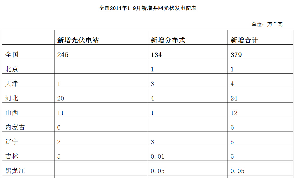 2014年前三季度,全國新增光伏發(fā)電并網(wǎng)容量379萬千瓦,其中,新增光伏電站并網(wǎng)容量245萬千瓦,新增分布式光伏并網(wǎng)容量134萬千瓦;全國光伏發(fā)電量約180億千瓦時(shí),相當(dāng)于2013年全年發(fā)電量的200%。