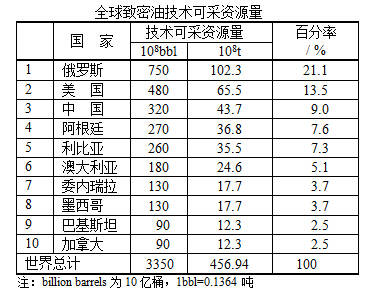 在石油價格大戰中提及的頁巖油是指致密油。根據美國能源情報署資助的先進資源國際公司(Advanced Resources International, Inc.)于2013年的評價,俄羅斯致密油技術可采資源量最多,居世界第一,其次為美國和中國,三個國家的致密油技術可采資源量之和占世界總量的43.6%。