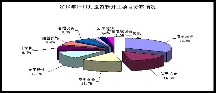 1-11月,電子信息產業(yè)新開工項目7564個,同比增長1%,出現(xiàn)今年3月以來的首次正增長,但仍低于去年同期5.7個百分點。其中,通信設備、電子元件行業(yè)新開工項目繼續(xù)下滑,降幅分別為-1.0 %和-2.4 %,但降幅比1-10月收窄2.1 和2.6個百分點;電子器件新開工項目轉負為正,同比增長1.7 %;計算機、電子專用設備、信息機電行業(yè)新開工項目分別增長2.4 %、4.1 %和6.0 %。