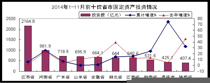 1-11月,西部地區(qū)完成投資1838.7 億元,同比增長23.0 %,增速與1-10月持平,低于去年同期8.7個百分點,其中重慶和陜西分別增長74.6 %和32.1 %。東部地區(qū)完成投資5025.7 億元,同比增長3.7 %,低于全國平均水平7.1個百分點,占全國比重46.1 %,同比下降3.1個百分點,其中北京、天津、上海三市投資繼續(xù)負增長,江蘇、廣東、浙江、山東等省投資增速持續(xù)放緩。中部地區(qū)完成投資3581.2 億元,同比增長17.1 %,增速比1-10月回落2.3個百分點,其中河南、湖南兩省投資同比增長25.2 %和24.2 %,高于全國平均水平14.4和13.4個百分點。東北三省完成投資458.5 億元,同比增長3.8 %,增速低于去年同期6.6個百分點,比1-10月回落1個百分點。