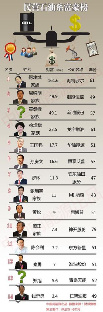 歲末年初,國內(nèi)首張民營石油系富豪榜單由中國網(wǎng)能源頻道獨家策劃發(fā)布。從今年發(fā)布的首張富豪榜來看,北京派特羅爾油田服務(wù)股份公司董事長何建斌及其家族以161億元問鼎首富;第二名為潛能恒信控制人周錦明,財富數(shù)量接近50億元;第三名為新疆克拉瑪依新科澳石油天然氣技術(shù)股份有限公司董事長黃健峰及其家族,財富數(shù)量49.1億元。