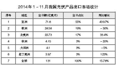 在日前由中國光伏行業協會主辦的“光伏行業發展與投資分析——2014年回顧與2015年展望”研討會上,中國機電產品進出口商會副秘書長孫廣斌分享了最新的光伏產品進出口統計數據,并對光伏貿易糾紛對我國光伏產業帶來的影響進行了分析。面對森嚴的貿易壁壘,在2013年光伏產品出口額同比下降近18%的基礎上,2014年迎來觸底反彈,1~11月出口額同比增長近16%,達到131億美元。其中,日本市場同比增長67%,達到45億美元,占到出口總額的33%;美國市場同比增長35%,達到21億美元,占到出口總額的16%;歐洲市場萎縮30%,不足25億美元,份額降至18.75%。