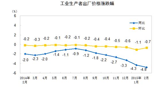 2015年2月份,全國工業生產者出廠價格同比下降4.8%,環比下降0.7%。工業生產者購進價格同比下降5.9%,環比下降1.0%。1-2月平均,工業生產者出廠價格同比下降4.6%,工業生產者購進價格同比下降5.5%。