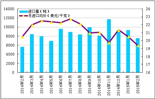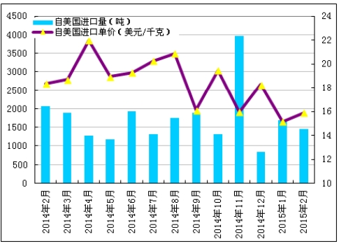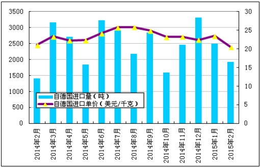 圖1 2014年2月-2015年2月多晶硅進(jìn)口量及進(jìn)口均價(jià)示意圖數(shù)據(jù)來源:海關(guān)