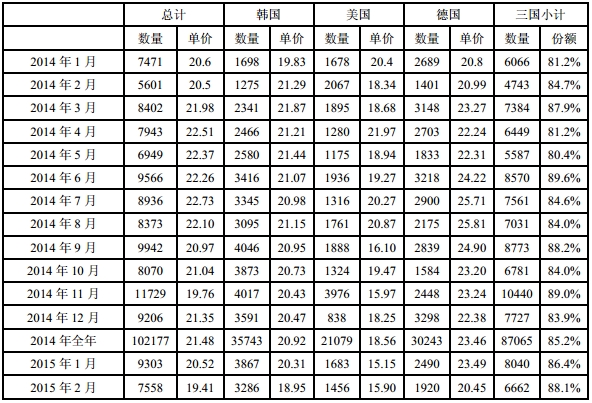 2015年2月份從韓國進(jìn)口多晶硅量減少至3286噸,環(huán)比減少15.0%;2月份進(jìn)口單價(jià)小幅下滑至18.95美元/千克,環(huán)比降幅為6.7%。