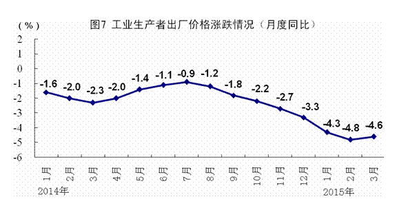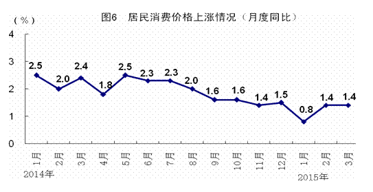 一季度,居民消費價格同比上漲1.2%。其中,城市上漲1.2%,農(nóng)村上漲1.0%。分類別看,食品價格同比上漲1.9%,煙酒及用品下降0.5%,衣著上漲2.9%,家庭設(shè)備用品及維修服務(wù)上漲1.2%,醫(yī)療保健和個人用品上漲1.7%,交通和通信下降1.8%,娛樂教育文化用品及服務(wù)上漲1.2%,居住上漲0.7%。在食品價格中,糧食價格上漲2.8%,油脂價格下降5.1%,豬肉價格下降1.7%,鮮菜價格上漲1.4%。3月份,居民消費價格同比上漲1.4%,環(huán)比下降0.5%。一季度,工業(yè)生產(chǎn)者出廠價格同比下降4.6%,3月份同比下降4.6%,環(huán)比下降0.1%。一季度,工業(yè)生產(chǎn)者購進(jìn)價格同比下降5.6%,3月份同比下降5.7%,環(huán)比下降0.3%。