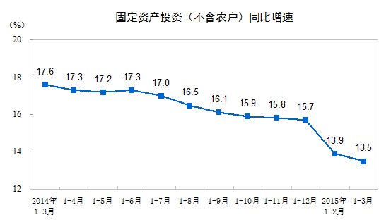 統計局今日公布數據顯示,2015年1-3月份,全國固定資產投資(不含農戶)77511億元,同比名義增長13.5%(扣除價格因素實際增長14.5%),增速比1-2月份回落0.4個百分點。從環比速度看,3月份固定資產投資(不含農戶)增長1.04%。