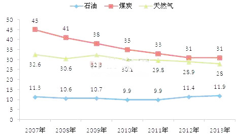 圖表1:2007-2013年全球傳統能源的儲采比情況(單位:年)