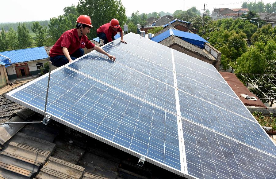 4月29日,在肥西縣山南鎮(zhèn)金牛社區(qū),工作人員在為一戶殘疾人家庭安裝光伏設(shè)備。為提高農(nóng)村貧困殘疾人家庭收入,安徽省肥西縣投資60萬元,為山南鎮(zhèn)、高店鄉(xiāng)20戶貧困殘疾家庭免費安裝3kW小型戶用光伏電站。預(yù)計5月上旬,這20個小型戶用光伏電站將正式并網(wǎng)發(fā)電,除滿足自家用電需求外,多余電量將出售給國家電網(wǎng)。據(jù)悉,肥西縣旨在通過“光伏下鄉(xiāng)扶貧工程”,充分利用農(nóng)村貧困殘疾人戶屋頂資源,建設(shè)家庭分布式光伏發(fā)電站,探索幫助他們脫貧解困的新路子。