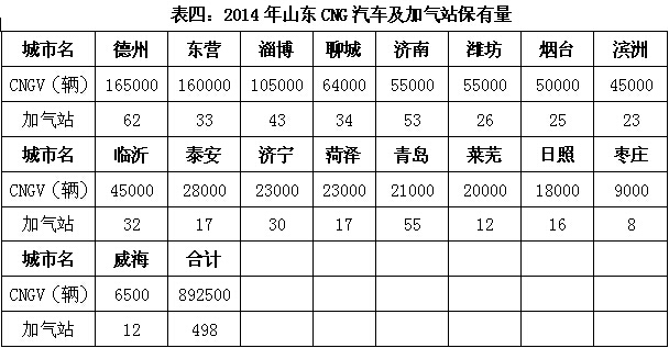 其中,山東和新疆的發展速度更令人驚訝。2014年山東CNG汽車從上年的69.45萬輛猛增至89.25萬輛,增速達28.5%。其中,德州、東營、淄博等三個地級行政區已上10萬輛(詳細表四)。其實山東CNG汽車的保有量在世界排名中也可名列第七位,剛好排在世界天然氣汽車的發祥地——意大利之前。山東LNG汽車保有量達1.8萬輛,加注站逾200座。也居全國首位。