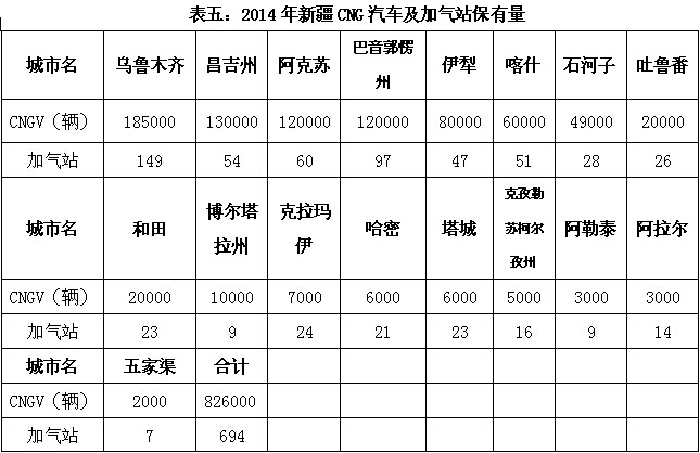2014年新疆CNG汽車從上年的65.17萬輛猛增至82.6萬輛,增幅達27.5%。更值得一提的是,新疆天然氣汽車的保有量在全疆汽車保有量的占比高達30%,穩居全國第一。其中烏魯木齊、巴音郭愣州、阿克蘇、昌吉等四個地級行政區保有量均超過10萬輛(詳表五)。此外,新疆CNG汽車的保有量在世界排名中也可名列第九位。