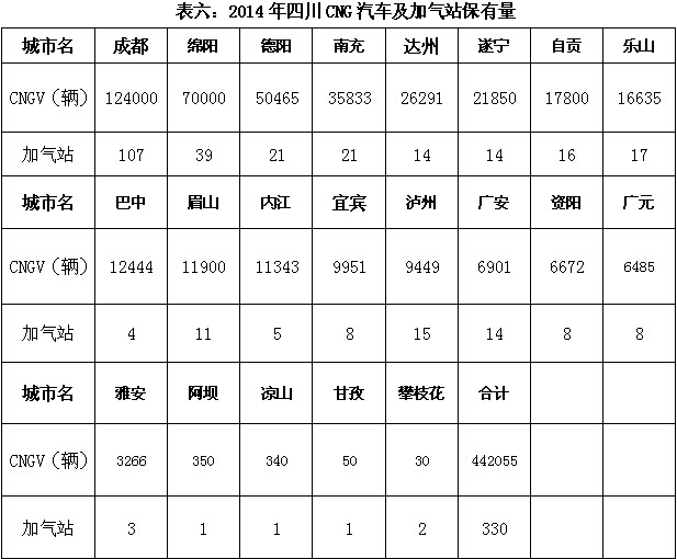CNG汽車保有量40萬輛以上的是全國名列第三的四川省(詳見表六);保有量30萬輛以上的為排名第四的河北?。槐S辛?0萬輛以上的有寧夏、內蒙、甘肅、河南和陜西等五省區;保有量10萬輛以上有山西和安徽。