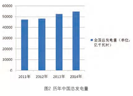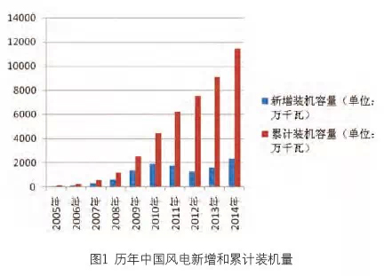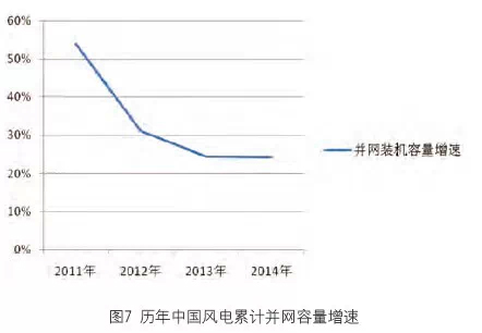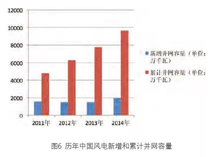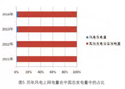 圖5顯示的是歷年中國(guó)風(fēng)電上網(wǎng)電量占全國(guó)發(fā)電量的比例,由2011年的1.67%到2014年2.8%,呈現(xiàn)逐年增加的趨勢(shì)。