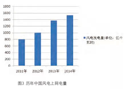 2014年風(fēng)電上網(wǎng)電量1550億千瓦時(shí)。由圖2可以看出,中國(guó)全國(guó)發(fā)電量在2012年到2013年期間增長(zhǎng)幅度較大,2014年的增幅有所減小。這樣的趨勢(shì)與中國(guó)風(fēng)電上網(wǎng)電量類似(圖3),只是中國(guó)風(fēng)電上網(wǎng)電量的增幅明顯高于全國(guó)發(fā)電量的增長(zhǎng)幅度,說(shuō)明中國(guó)風(fēng)電發(fā)電量增幅跑贏了中國(guó)發(fā)電量的增幅。