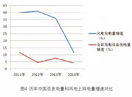 然而,由圖4可以看出,2014年中國(guó)風(fēng)電上網(wǎng)電量的增長(zhǎng)幅度在與歷年相比時(shí),明顯處于下降趨勢(shì)。其增幅雖然超過(guò)了10%,但與2011年、2012年的增幅超過(guò)40%相差甚遠(yuǎn)。與其相比,中國(guó)全國(guó)發(fā)電量的增幅下降并沒(méi)有那么明顯,雖然歷年總體也呈現(xiàn)下降的趨勢(shì)。