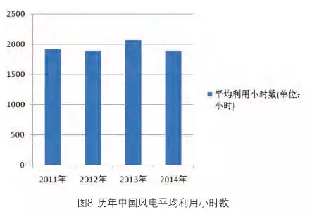 2014年中國(guó)的風(fēng)電平均利用小時(shí)數(shù)與2013年相比有明顯下降(圖8),為1893小時(shí),同比下降約180小時(shí)。主要原因是全國(guó)來(lái)風(fēng)情況普遍偏小,全國(guó)陸地70米高度年平均風(fēng)速約為5.5米/秒,比往年偏小8%-12%。風(fēng)電平均利用小時(shí)數(shù)最高的地區(qū)是云南2511小時(shí),最低的地區(qū)是西藏1333小時(shí)。
