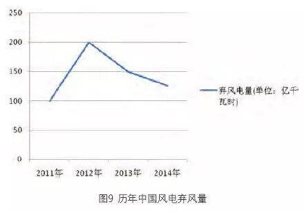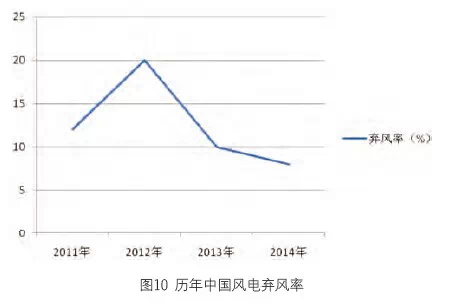 圖9、圖10顯示,棄風(fēng)電量和棄風(fēng)率相比2012年和2013年都有下降,棄風(fēng)限電情況有所好轉(zhuǎn)。其中2014年中國(guó)風(fēng)電平均棄風(fēng)率為8%,同比下降4個(gè)百分點(diǎn),達(dá)到近年來(lái)最低值,全國(guó)除新疆地區(qū)外棄風(fēng)率均有不同程度的下降。