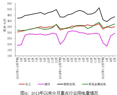 1-5月份,化學原料制品、非金屬礦物制品、黑色金屬冶煉和有色金屬冶煉四大高載能行業用電量合計6699億千瓦時,同比下降 1.7%,增速同比回落6.0個百分點;合計用電量占全社會用電量的比重為30.6%,對全社會用電量增長的貢獻率為-49.5%。其中,化工行業用電量1697億千瓦時,同比增長1.6%,增速同比回落3.2個百分點;建材行業用電量1170億千瓦時,同比下降6.6%,增速同比回落16.2個百分點;黑色金屬冶煉行業用電量2069億千瓦時,同比下降6.5%,增速同比回落7.8個百分點;有色金屬冶煉行業1763億千瓦時,同比增長5.0%,增速同比提高0.9個百分點。