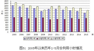 分類型看,1-5月份,全國水電設備平均利用小時1142小時,同比提高57小時;水電裝機容量超過1000萬千瓦的7個省份中,湖南、青海和云南同比分別下降179小時、31小時和9小時,湖北和四川同比分別增長140小時和30小時,貴州、廣西同比分別提高458小時、380小時。全國火電設備平均利用小時1813小時,同比下降186小時,降幅比2014年同期擴大169小時;其中青海2493小時,海南、寧夏、江蘇、江西、河北、陜西和貴州超過2000小時;云南和西藏火電設備利用小時低于1000小時,分別為878小時和48小時;與上年同期相比,共有27個省份火電利用小時同比下降,其中,北京、云南、寧夏、四川和重慶下降超過400小時。全國核電設備平均利用小時2793小時,同比下降49小時。全國風電設備平均利用小時857小時,同比下降6小時。
