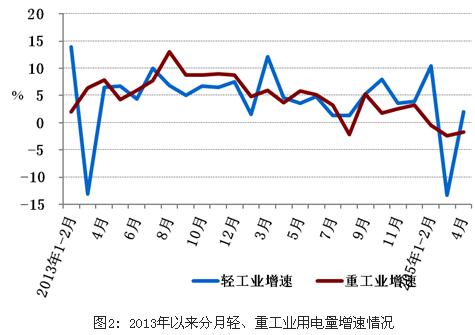 1-4月份,全國工業用電量12079億千瓦時,同比下降0.8%,增速同比降低5.6個百分點,占全社會用電量的比重為69.8%,對全社會用電量增長的貢獻率為-60.3%。其中,輕、重工業用電量分別為2014和10065億千瓦時,同比分別增長1.9%和下降1.3%,增速同比分別降低3.1和6.1個百分點。