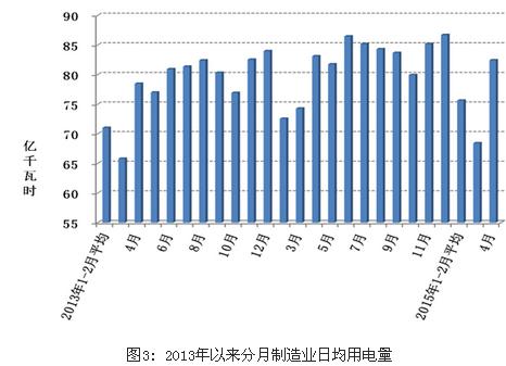 1-4月份,全國制造業用電量9060億千瓦時,同比下降0.2%,增速同比降低5.9個百分點。4月份,全國制造業用電量2474億千瓦時,同比下降0.8%;制造業日均用電量82.5億千瓦時/天,分別比上年同期和上月減少0.7億千瓦時/天和增加14.0億千瓦時/天。