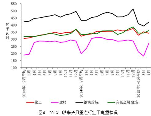 1-4月份,化學原料制品、非金屬礦物制品、黑色金屬冶煉、有色金屬冶煉四大高載能行業用電量合計5250億千瓦時,同比下降 1.8%,增速同比回落6.3個百分點;合計用電量占全社會用電量的比重為30.3%,對全社會用電量增長的貢獻率為-59.2%。其中,化工行業用電量1351億千瓦時,同比增長2.9%,增速同比回落1.6個百分點;建材行業用電量877億千瓦時,同比下降6.5%,增速同比回落17.1個百分點;黑色金屬冶煉行業用電量1632億千瓦時,同比下降6.9%;增速同比回落8.4個百分點;有色金屬冶煉行業1390億千瓦時,同比增長3.7%,增速同比回落1.0個百分點。