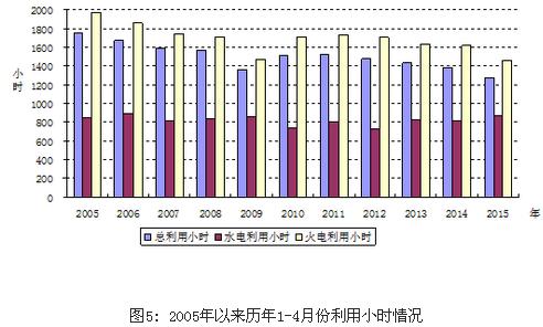 分類型看,1-4月份,全國水電設備平均利用小時866小時,同比提高57小時;水電裝機容量超過1000萬千瓦的7個省份中,云南、湖南和青海同比分別下降163小時、57小時和20小時,四川增長50小時,貴州、廣西同比分別提高397小時、369小時。全國火電設備平均利用小時1462小時,同比下降158小時,降幅比2014年同期擴大161小時;其中青海2091小時,海南、寧夏、江蘇、江西、新疆、河北、陜西和貴州超過1600小時;云南和西藏火電設備利用小時低于1000小時,分別為679小時和44小時;與上年同期相比,共有27個省份火電利用小時同比下降,其中,重慶、寧夏、北京和四川下降超過300小時。全國核電設備平均利用小時2187小時,同比下降166小時。全國風電設備平均利用小時672小時,同比上升17小時。