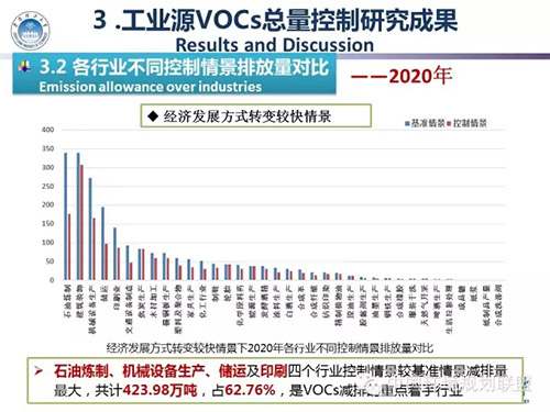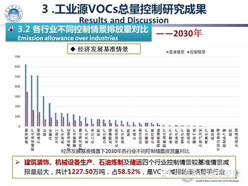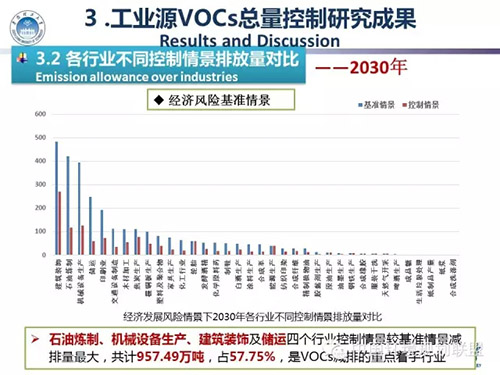 研究結(jié)果表明,在經(jīng)濟(jì)發(fā)展基準(zhǔn)情景下,我國2020年、2030年工業(yè)源VOCs控制總量分別為1790.27萬噸、1822.36萬噸,相較于基準(zhǔn)年2010年排放量分別增長28.75%、31.06%。建筑裝飾、機(jī)械設(shè)備生產(chǎn)、石油煉制以及儲運(yùn)等行業(yè)為VOCs排放的重點(diǎn)行業(yè)。