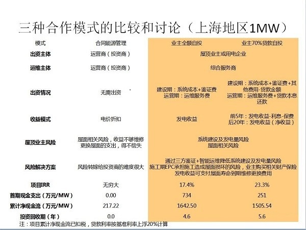 給大家算筆帳。以上海為例,假設(shè)有兩個條件完全一樣的1MW電站,一個是EMC模式,一個業(yè)主自投模式。因為EMC模式,業(yè)主收入的只有租金,整個25年的生命周期里,電站的收益只在電價優(yōu)惠上;而業(yè)主自投完全不同,電站每發(fā)1度電,國家補貼、上海市補貼、與傳統(tǒng)火電相比節(jié)約的電費以及余電上網(wǎng)回收的電費,整個收益加起來是EMC模式下,業(yè)主收益的4倍!