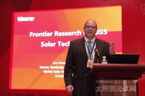 漢能GSE全球副總裁Darren Verebelyi介紹CIGS技術。