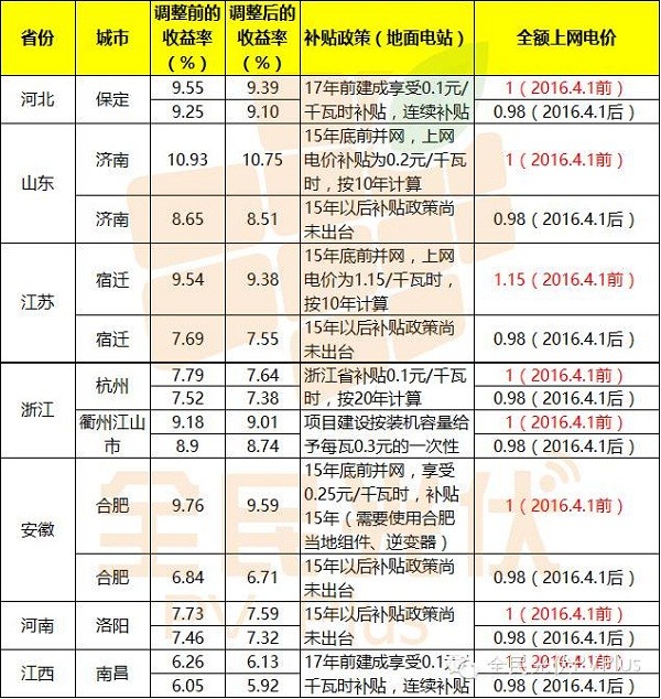 表中所用全額上網電價(2016.4.1前)依據國家發改委2013年發布的《關于發揮價格杠桿作用促進光伏產業健康發展的通知》,2016.4.1后的全額上網電價依據國家發改委今年十月下發的《關于完善陸上風電、光伏發電標桿上網電價的通知》。