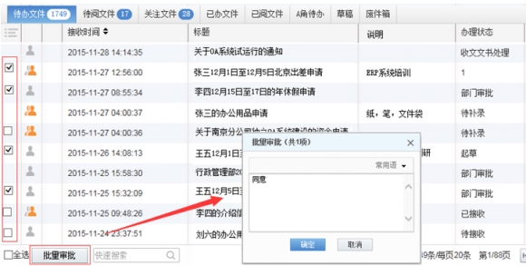 按照企業(yè)外出請假管理制度和程序,企業(yè)員工因公出差、因私請假、外出辦公,都需要填寫申請單提交領(lǐng)導(dǎo)審批。OA系統(tǒng)實現(xiàn)了此類管理從線下到線上的固化,但領(lǐng)導(dǎo)在審批時,卻可能有多個審批單在領(lǐng)導(dǎo)待辦中等待審批,需要領(lǐng)導(dǎo)一個一個打開進(jìn)行審批。在慧點科技OA系統(tǒng)中,領(lǐng)導(dǎo)可以在待辦事項列表中直接查看到員工的出差、請假、外出事由,直接勾選多條待審批事項,點擊“批量審批”,填寫審批意見后,一鍵完成批復(fù)。
