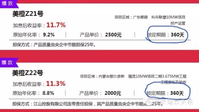 12月28日,綠能寶用戶收到了這樣的一條短信:“爆款來襲,加息后年化高達11.7%!上市公司擔保,投資安全穩定!年終加息,滿贈活動進行中,詳見綠能寶官網。”嚇死本寶寶了,其實這種加息后收益率的計算,是在原有收益率的基礎上進行疊加的結果,這兩款產品都帶有附加的擔保責任,與之前剛剛發布的航天米寶所宣稱的“有保險的P2P產品”,有著異曲同工之妙。