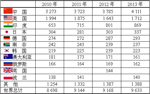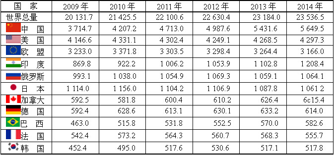 根據BP公司《世界能源統計評述》,從2009年至2014年的六年間,電力消費增加了17%,而中國增加了52%,美國只增加4%。由于中國的經濟快速發展,在2011年發電量已經超過美國,成為世界上最大的電力生產國(見表1)。