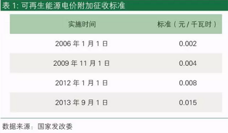 為了滿足可再生能源電力發展,并且彌補可再生能源補貼拖欠,從2016年1月1日起,可再生能源電價附加征收標準從之前的1.5分/千瓦時提高到1.9分/千瓦時。這次發改委從頒布通知到開始正式執行僅兩天之隔,一定程度上反映了增加附加滿足補貼的緊迫性。這與我們關于電價附加會在近期上調的預測吻合,但實際增加的幅度卻遠遠低于我們的預估。下面這篇分析給出了詳細解釋。