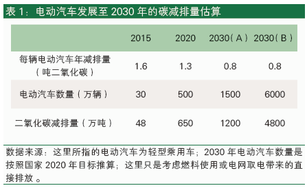 中國2013年70%左右的電力消費(fèi)來自煤電【21】,2030年這一比例將下降至33%上下【22】。電力系統(tǒng)的持續(xù)低碳發(fā)展將增強(qiáng)交通電氣化的碳減排效應(yīng)。當(dāng)前每輛電動汽車替代汽油車每年可減少的碳排放量約為1.6噸【23】,雖然電網(wǎng)排放因子將來會大幅降低,但是汽油車碳排放效率也在提高,我們假設(shè)到2020年單輛電動汽車相比傳統(tǒng)的汽油車一年能減少碳排放1.3噸,2030年會進(jìn)一步降至0.8噸。