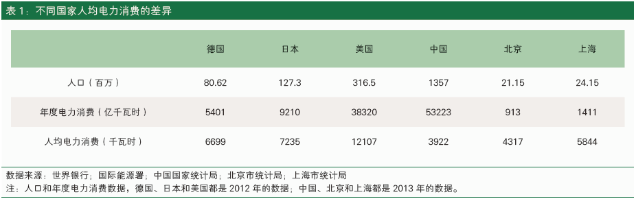 人均電力消費在很大程度上代表著一個國家、社會或者區(qū)域的經濟發(fā)展水平,一般來講,經濟發(fā)展水平越高,人均電力消費會越高。從表1可以看出,美、德、日三個發(fā)達國家的人均電力消費要遠遠高過中國。在中國,經濟最發(fā)達的上海,人均電力消費不僅遠遠超過全國平均,而且顯著高于北京。