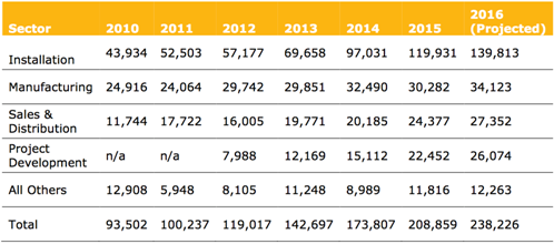 近日,美國宣布太陽能投資稅收抵免(ITC)將延長五年至2020年后,美國非營利組織太陽能基金會(TSF)公布了美國太陽能產業當前就業情況的調查結果。這份“太陽能就業普查”顯示,美國太陽能行業目前擁有員工208859人,僅2015年一年時間就增長了35052人,增長率達20%,占全美新增就業人數的1.7%。太陽能基金會主席兼執行董事Andrea Luecke在陳述中說,“2010年以來,太陽能就業增長了123%,新增近115000個高新工作崗位。我們的調查結果還顯示,過去的12個月里,美國每增加83個工作崗位中就有1個(即1.2%)屬于太陽能產業。”