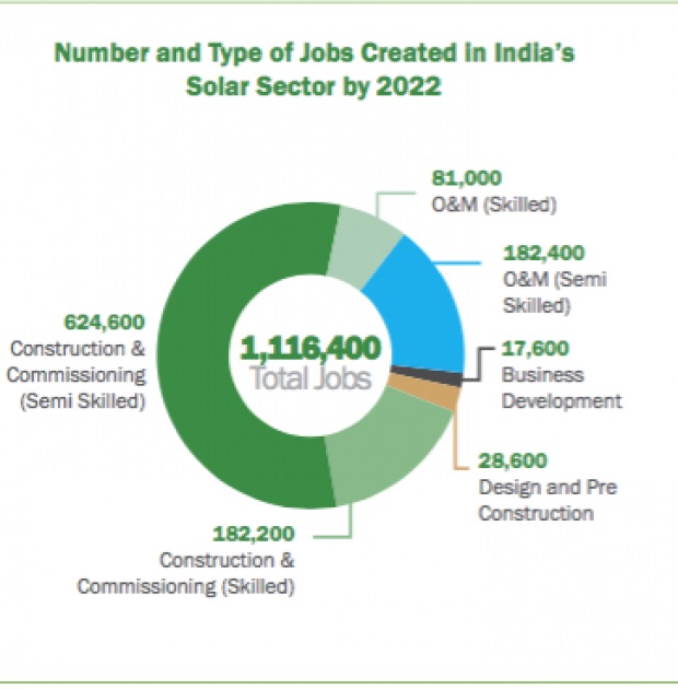 美國環保行動小組自然資源保護委員會(NRDC)與印度能源、環境和水委員會(CEEW)出版的《填補印度清潔能源市場的技能差距:太陽能焦點》發現,到2022年印度實現100GW的太陽能目標將需要: