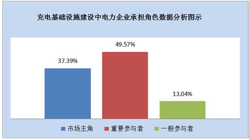 在電動汽車基礎設施建設領域,電力企業與社會資本合作大幕已經開啟,如何進一步深入,對電動汽車產業未來發展將起著重要的作用。調查數據顯示,在充電樁建設中,認為電力企業是主角的占到了37.39%,認為是重要角色的占比為49.57%;認為是一般參與者的為13.04%。