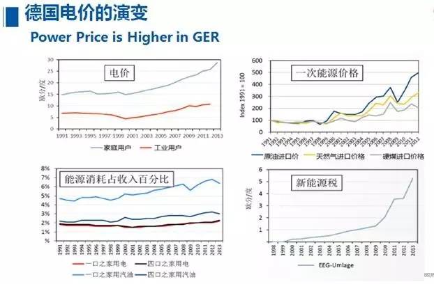 伴隨從1996年到2004年,德國電力改革頒布一系列法案。電改后,德國電網運營商從電力產業價值鏈的其他行業中獨立出來,電網客戶有權從任何目前在自己本區域內有供電權的經銷商處購電,從事金融領域的非電力行業也積極參與到電力交易中來。而德國的電價在電力改革后,由于各種新興設備的投入,新能源稅的不斷提升,直到2013年電價呈不斷上漲趨勢。但在近兩年,德國電價逐步下滑,這也是有賴于新能源稅的減負。