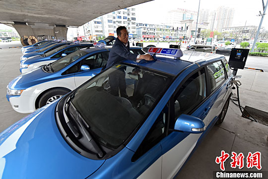 4月19日,山西太原,電動出租車在高架橋下新建的充電樁旁充電。中新社記者 武俊杰 攝
