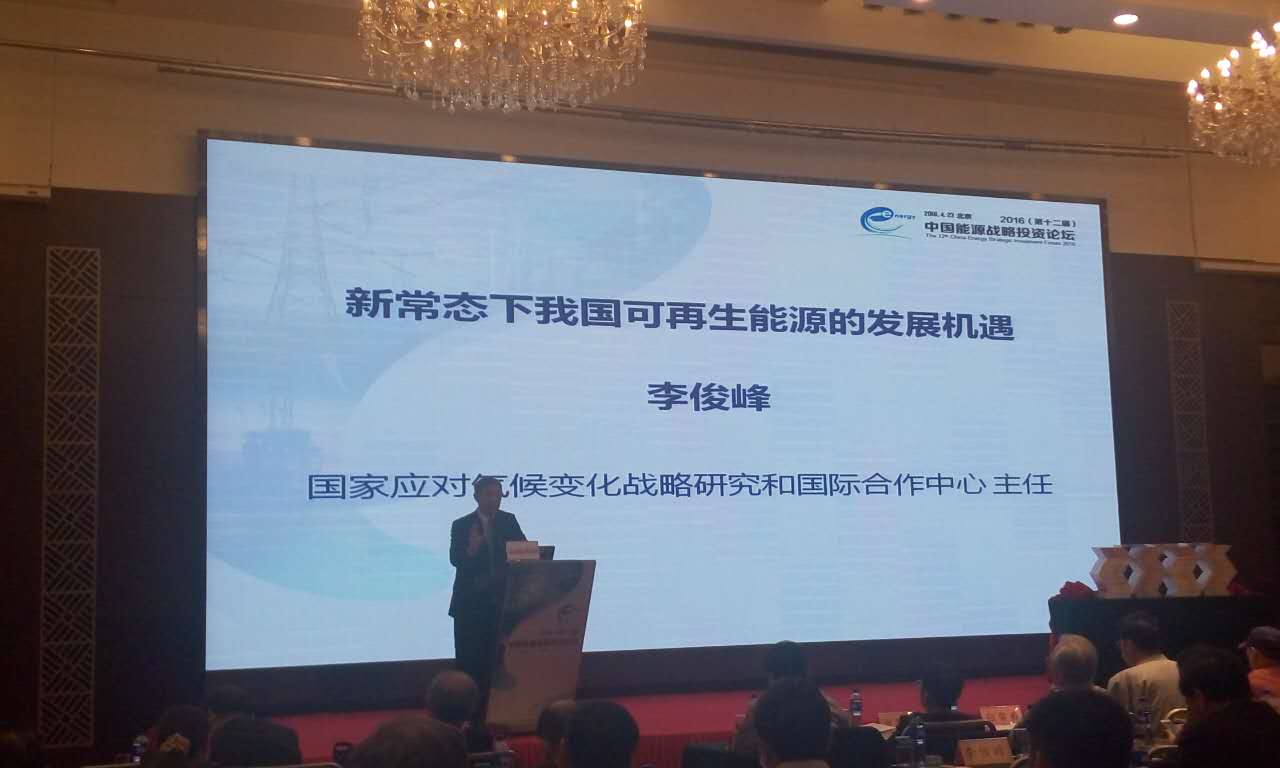 國家應對氣候變化戰略研究和國際合作中心主任李俊峰做主題演講,題目是新常態下我國可再生能源的發展機遇。