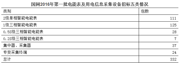 國網(wǎng)2016年第一批電能表及用電信息采集設(shè)備招標活動中,72家供應(yīng)商在五類設(shè)備招標中共中標332個包。五類物資及包數(shù)分別為:2級單相智能電能表111包、1級三相智能電能表125包、0.5S級三相智能電能表28包、0.2S級三相智能電能表7包、集中器/采集器37包、專變采集終端24包。