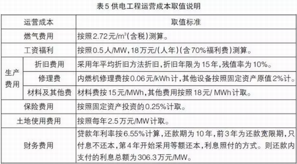 發(fā)電工程日常運(yùn)營(yíng)成本主要包括:燃?xì)赓M(fèi)用、工資福利、生產(chǎn)費(fèi)用(折舊費(fèi)、修理費(fèi)、材料費(fèi)及其他費(fèi)用)、土地費(fèi)用和財(cái)務(wù)費(fèi)用,具體取值標(biāo)準(zhǔn)如表5所示。