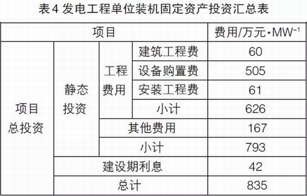 綜上,發(fā)電工程的單位裝機(jī)固定投資成本為835萬(wàn)元/MW,詳見(jiàn)表4所示。