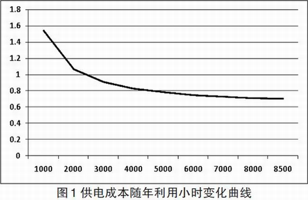 供電成本隨年發(fā)電利用小時(shí)數(shù)的變化曲線如圖1所示,從曲線來(lái)看,年利用小時(shí)數(shù)小于3000h,供電成本隨年利用小時(shí)數(shù)變化較大,年利用小時(shí)數(shù)大于3000h,供電成本隨年利用小時(shí)數(shù)的變化較小。